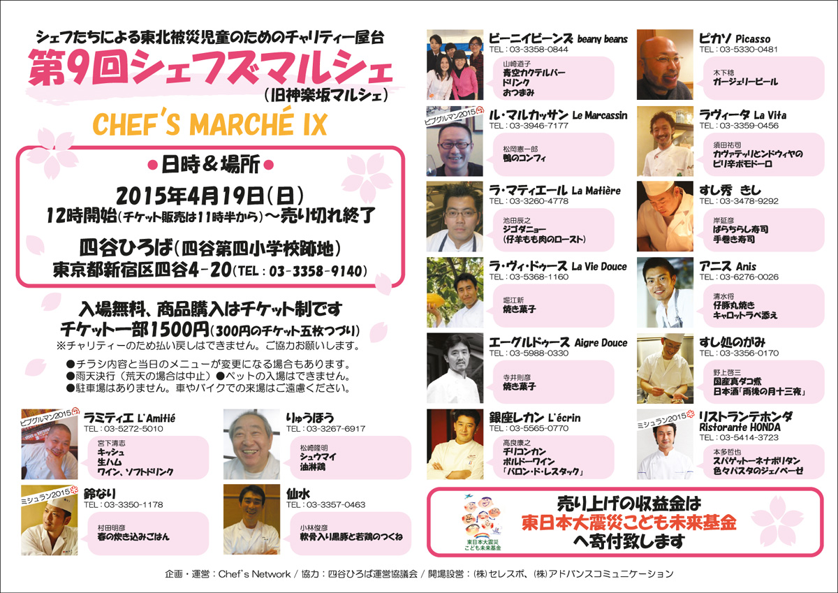 東京・新宿区の四谷ひろば(四谷第四小学校跡地)にて、「シェフたちによる東北被災児童のためのチャリティ屋台」の第9回が開かれます。収益金は当基金に寄付していただくことになりました。