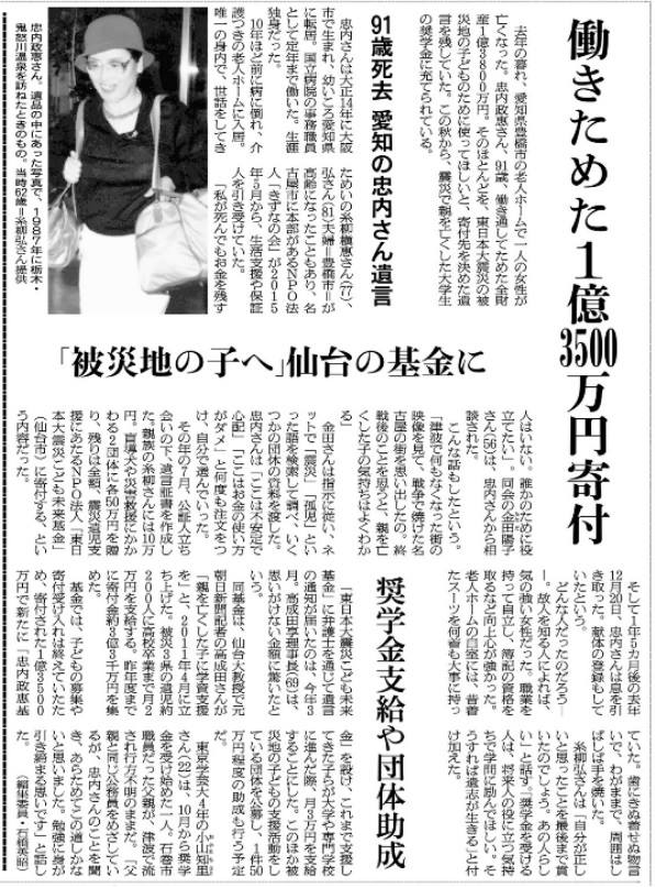 同日付の朝日新聞宮城版に、当基金が設けた「忠内政惠・三上きせ記念基金」のもとになった忠内政惠さんについての記事が掲載されました。